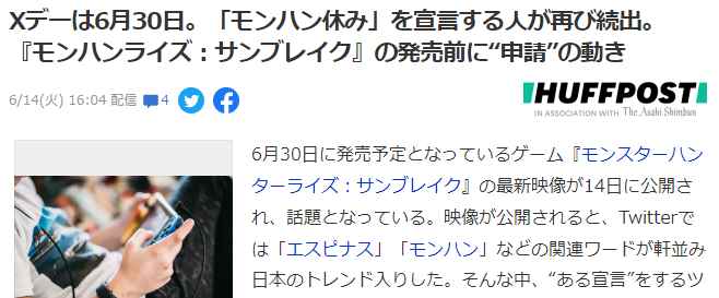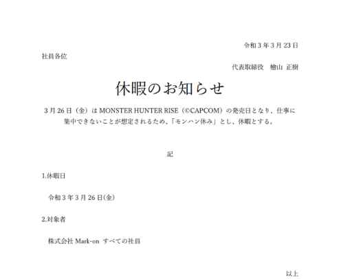 去年某会社的“怪猎休假”公告 ·如今《怪猎崛起》曙光大型资料片即将于6月30日发售,玩家们又开始鼓动起“怪猎休假”事宜,虽然在相对严苛保守日本会社中老板放假的机会不大,不过相信主动请假的玩家也不会在少数。