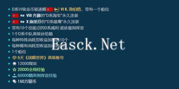 主题活动通行证 最新的活动通行证也是专门为庆祝活动准备的,除了常规奖励外,还包括各种D系战舰的永久涂装,甚至还有一艘VI级金币驱逐舰! 在第一个进度条中,您将能获得魏玛臂章;“黑、白、红”和“黑、红、金”永久涂装;VII 海因里希亲王的“D系海军”永久涂装,以及IX 鲁普雷希特王子的“D系雄鹰”永久涂装作为最终奖励。完成第一个进度条的每个额外等级可以获得1个更多信号旗补给箱。 如果您已经拥有了魏玛臂章,VII 海因里希亲王的“D系海军”永久涂装或IX 鲁普雷希特王子的“D系雄鹰”永久涂装,您将分别获得225000,300万或750万银币补偿。