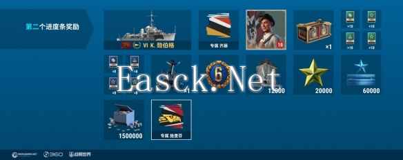 如果您已经拥有了VI K. 勋伯格,您将获得795万银币补偿。如果您已经拥有了VIII 齐藤的“D系海军”永久涂装或X 施里芬的“D系雄鹰”永久涂装,您将分别获得450万或900万银币补偿。 第二个进度条的奖励