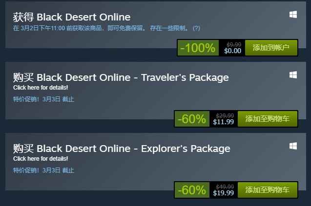 目前《黑色沙漠》正处于限时免费领取的状态,原版售价为9.99美元(约合70元),在3月2日前可以免费领取。除此之外,《黑色沙漠》的“旅行者包”与“探索者包”也正在4折优惠中,分别售价11.99美元(约合84元)和19.99美元(约合140元人民币…),想要领取本作的玩家可以在改区后点击下方链接前往领取。 Steam商店页面:点我了解☜