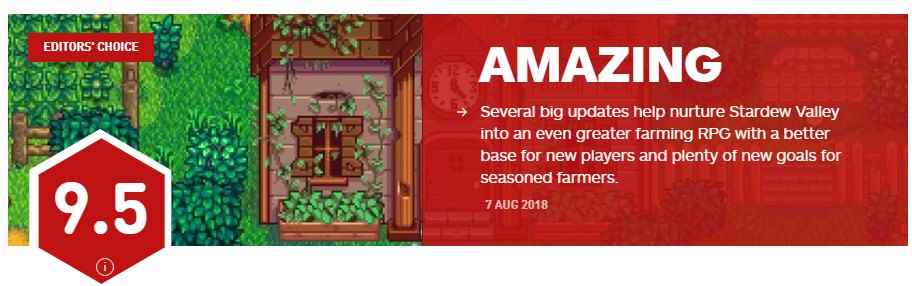 IGN今天更新《星露谷物语》的评分,这款由ConcernedApe开发的经营模拟游戏在更新多人模式后获得了9.5分的高分成绩,早前的评分是8.6分,游戏已在2016年2月27日登陆Steam,支持简体中文。