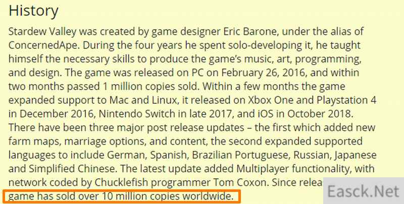 《星露谷物语》是一款休闲模拟类的游戏,发售后吸引了许多玩家关注。《星露谷物语》登陆了包括PC在内的多个平台,销量非常高。近日据外媒dualshockers报道,《星露谷物语》全球销量已超过1000万份。虽然官方还没有正式公布这一消息,但其新闻页面已经巧妙透露了这一成就。