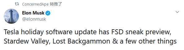特斯拉CEO马斯克表示:“特斯拉的假期软件更新中不仅会为用户提供全自动驾驶的试用机会,还会加入《星露谷物语》以及《西洋双陆棋》等一系列内容。”