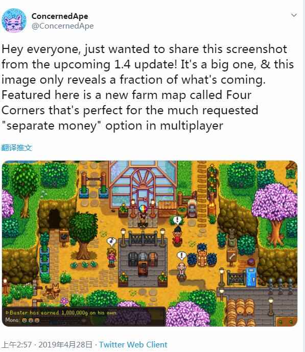 《星露谷物语》自发售以来已经陪伴玩家度过了三年时间,而创作者仍然孜孜不倦的在对其进行更新。开发者ConcernedApe在今日发推表示,第1.4版本的大更新即将来临,包含了不少玩家一直诉求的改进和新内容。