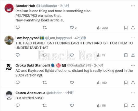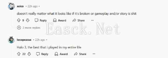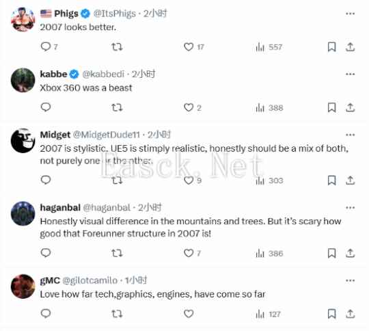 推主Pirat_Nation也将其进行了对比,在评论区里,玩家们的看法不一,有玩家表示:“2007的《光环3》倾向于风格化设计,而虚幻5下的《光环》则纯粹追求现实感,但实际上,理想的状态应是两者巧妙融合,而非单一地倾向任何一方。”还有玩家说道:“《光环3》真的领先于时代。”“如果(虚幻5下的《光环》)游戏玩法和剧情一团糟,它的画面就不重要了。” 部分玩家评论: