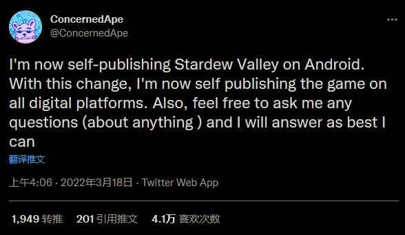 Stardew Valley 的创作者 Eric “ConcernedApe” Barone 今天宣布,他现在将在安卓设备上自行发行游戏,这意味着他将承担所有数字平台的全部发布责任。