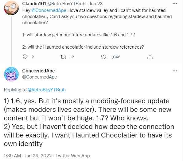 Eric Barone回复表示:“1.6版本,会有的,但更新大部分是游戏模组内容(使得模组运行更加容易),当然也会有部分向内容但不多,至于1.7?谁知道呢。《恐怖巧克力工厂》会参考《星露谷物语》,但我还没决定两个作品之间的联系到底多深。我希望《恐怖巧克力工厂》拥有自己的特点。”
