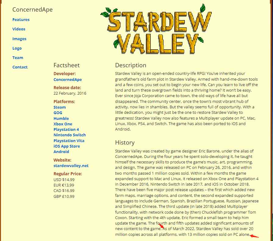《星露谷物语》官方宣布,截止到2022年3月,游戏全平台销量超过2000万份,其中PC版约占1300万。