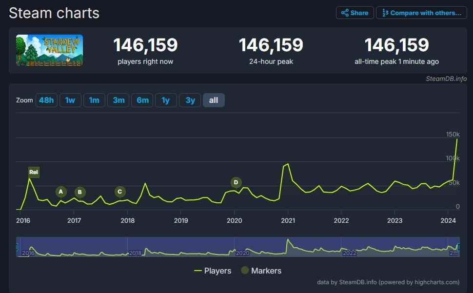 目前,《星露谷物语》的Steam同时在线玩家数量已突破14万(146,159),创下了游戏发售以来的新纪录,并还在不断上升中。