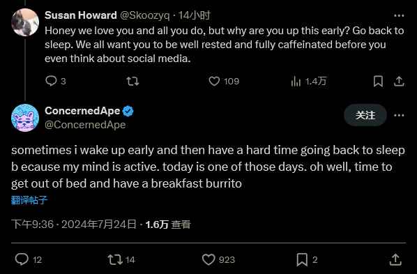 在回应一名粉丝因发布了这条推文的时间而担心他的身体健康时,Eric 回复道:“有时我会提前醒来,然后很难再睡着,因为我的思维很活跃。今天就是这样的一天。好吧,是时候起床吃早餐卷饼了。”