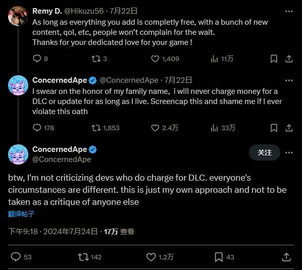 在推特上 Eric 写道:“顺便说一句,我并不是在批评对 DLC 收费的开发者。每个人的情况不同,这只是我自己的做法,并不是对任何人进行批评。”