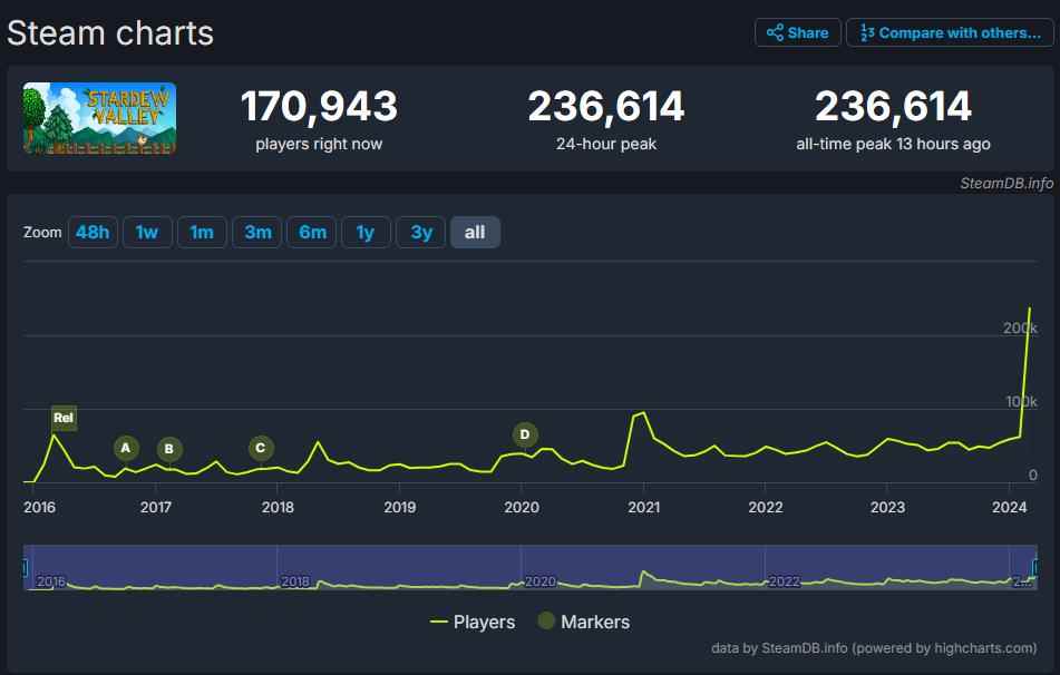 在《星露谷物语》1.6大版本更新之后,该作的Steam在线玩家数量开始飙升。现在根据SteamDB的数据,截止到目前,《星露谷物语》Steam同时在线人数已超过23.6万(236,614),创下了新纪录,并且1.6更新之后,也是《星露谷物语》Steam同时在线人数首次突破10万,此前的最高纪录是9.4万。