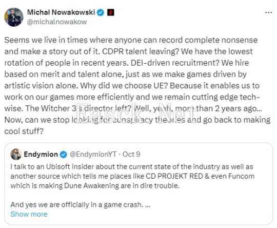 CDPR 联合首席执行官 Michal Nowakowski 发推文称,之前关于 CDPR 已陷入困境,因关注 DEI 和失去高级人才的传言是无稽之谈,呼吁停止阴谋论。