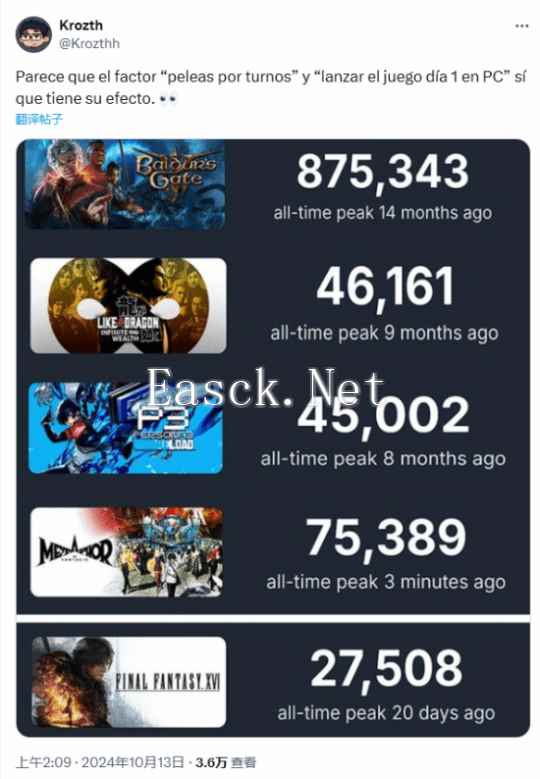 可以看到,在被列出来的这几款回合制游戏里,除了拉瑞安的《博德之门3》以外,《暗喻幻想:ReFantazio》的Steam峰值人数已超越了《如龙8》、《P3R》与《最终幻想16》。Krozthh表示:“看来‘回合制战斗’和‘在PC上第一天推出游戏’确实有着某种影响。”
