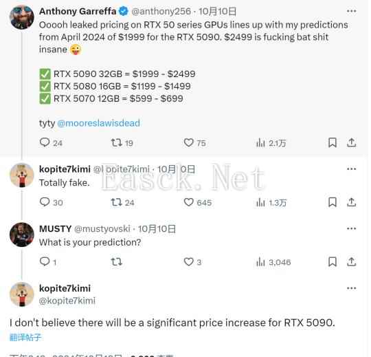 知名博主爆料RTX 5090价格不会比4090高出太多