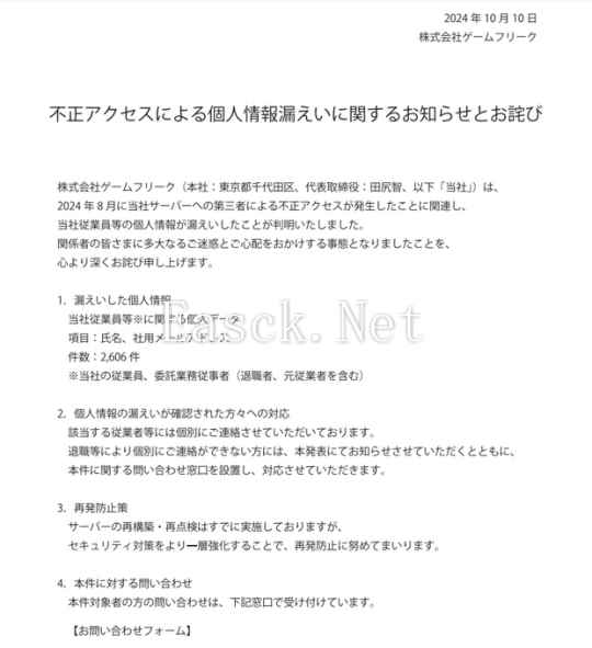 三天前,Game Freak 在其官网上发布了一份声明,证实外媒 Nintendo Life 最初报道的其服务器遭入侵、大规模泄密一事属实,并称此次事件有 2606 名员工受到影响。Game Freak 还表示员工数据以及所有《宝可梦》和 GF 游戏内容被泄露,入侵发生在 2024 年 8 月,且已采取措施尽量减少进一步的安全漏洞。