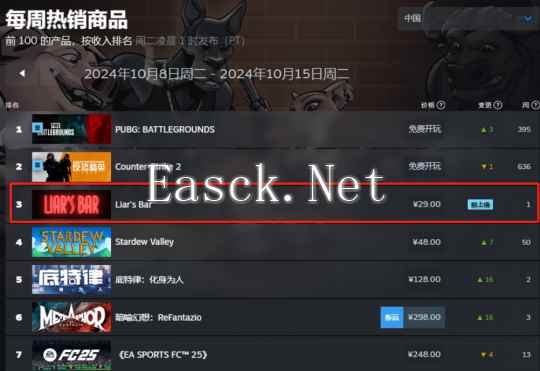 本期榜单后续出现的游戏,基本都是发布已久的作品,唯有一款游戏比较特殊,它就是排在第八的《骗子酒吧》。这是一款结合了扑克、俄罗斯轮盘赌以及心理博弈的多人联机小游戏,在国区榜单上排名第一。