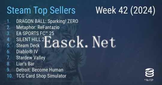 2024年第42周Steam周销榜TOP10 : 1、《七龙珠 电光炸裂!ZERO》 2、《暗喻幻想:ReFantazio》 3、《EA SPORTS FC 25》 4、《寂静岭2》 5、Steam Deck 6、《暗黑破坏神4》 7、《星露谷物语》 8、《骗子酒吧》 9、《底特律:变人》 10、《TCG 卡牌商店模拟器》