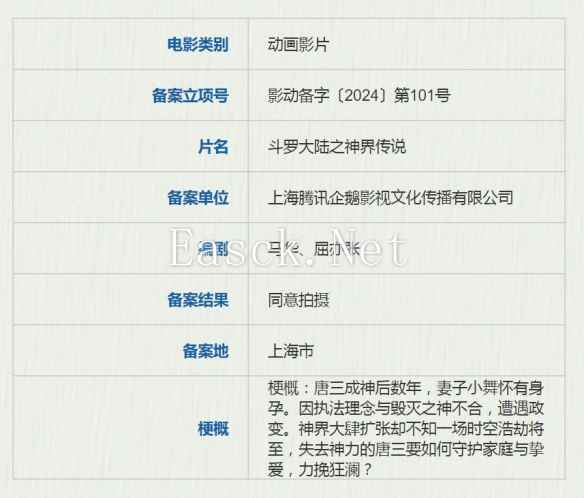 根据报道,《斗罗大陆》最新动画电影《斗罗大陆之神界传说》公开了备案信息。