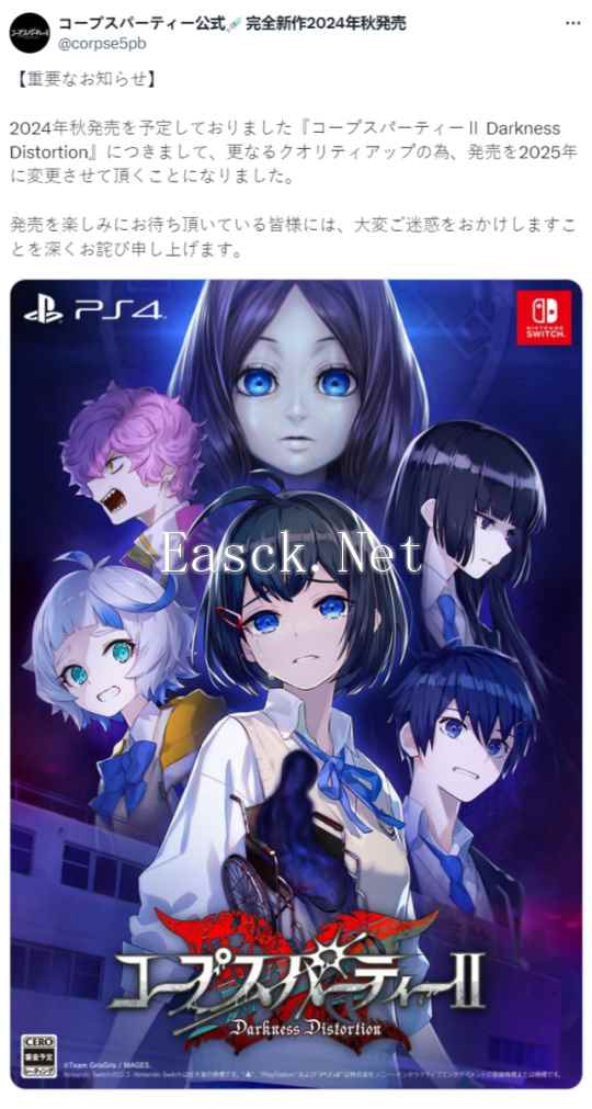 10月16日,开发商MAGES.宣布《尸体派对2:黑暗扭曲》将延期至2025年发售,该作原定于2024年秋季推出,登陆Switch和PS4,官方给出的延期理由是为了进一步提高游戏质量。 《尸体派对2:黑暗扭曲》是《尸体派对:驭血》的续集,也是该系列睽违九年的新作,本作的舞台是一家废弃医院,祁答院慎将继续担任剧情编剧。主角「七海遥」与实况主「高梨寝梦」和神秘学爱好者「棺まりあ」一起来到此地直播,并在废弃医院中为流传的都市传说「车椅子のアヤメさん」施咒;随后,不仅她们三人,就连在收看直播的观众都被卷入并迷失在医院里,她们必须设法逃出这间有可怕怪物四处徘徊的废弃医院。 |