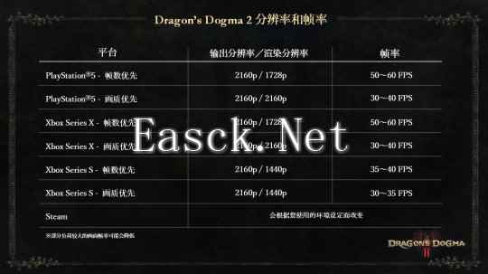 卡普空还公布了各平台在不同设置下的分辨率和帧率情况。从图表来看,主机平台中的 PS5、Xbox Series X ,在 “帧数优先” 的设置下能够以 50 - 60 帧运行,“画质优先” 时则能稳定在 30 帧以上运行。不过,Xbox Series S 在这两种设置下,其分辨率和帧率并没有太大的差别。值得一提的是,除了 Steam 外,其他主机平台均有上述表现。