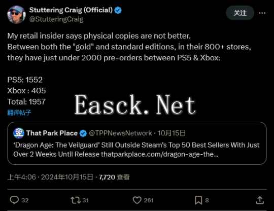 据游戏新闻播客 Side Scrollers Podcast 所有人 Stuttering Craig 在推特上分享,他从零售业内人士处获取消息,《龙腾世纪:影障守护者》在 PS5 和 Xbox 平台的实体总预订量仅为 1957 份,其中 PS5 为 1552 份,Xbox 仅有 405 份。这涵盖了游戏的基础版本和高级版,涉及 800 家商店。不过这并非官方数据,也并非完整市场的数据,但从中也可略见一斑。