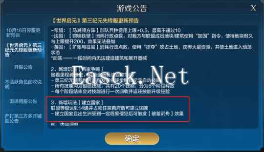 新增建立国家玩法 先锋服更新预告显示,S3赛季联盟等级达到14级并占领任意首府后可建立国家,建立国家且出生洲受到一定程度侵犯后,可触发“破釜沉舟”效果。(目前该效果具体效果不得而知)。