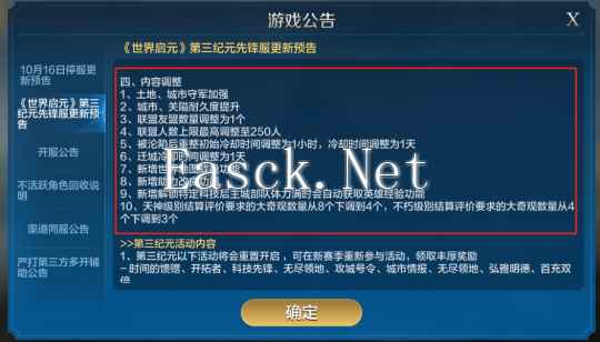 普通内容调整 ①土地、城市守军加强。(前期开荒难度可能会更高) ②城市、关隘耐久度提升。(联盟打城的速度会受到一定影响) ③联盟友盟数量调整为1个。 ④联盟人数上限最高调整至250人(比现在多了50人,结合第③点看提高了联盟的重要性) ⑤被沦陷后重整初始时间调整为1小时,冷却时间调整为一天。 ⑥迁城冷却时间调整为1天。(结合第⑤点,S3赛季官方将更鼓励PVP玩法)。 ⑦新增世界地图战役功能。(目前不知晓该功能长什么样,但大概率会对区服局势判断更清晰) ⑧新增助力改良功能。(萌新玩家的福音,联盟之间互帮互助很不错的更新)