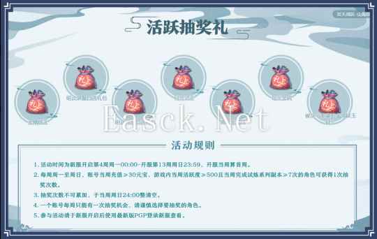 详细规则: 1)活动时间为新服开启日-开服第24周的周日23:59,开服当周算首周。 2)仙友可一共设置4次冲级目标,每次只能设置1个,当达到当前设置的目标后方可设置下次目标。 3)达到相应目标后可以领取对应奖励。请仙友根据自身情况合理进行设置。 4)参与活动请于新服开启后使用最新版PGP登录新服查看。 【活跃抽奖礼】 活动开始后,每周达到活跃目标的账号可以获得1次抽奖机会,100%中奖,更有可交易昭武装备、11级金精铁玉等高价值物品,加油成为欧皇吧!
