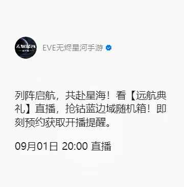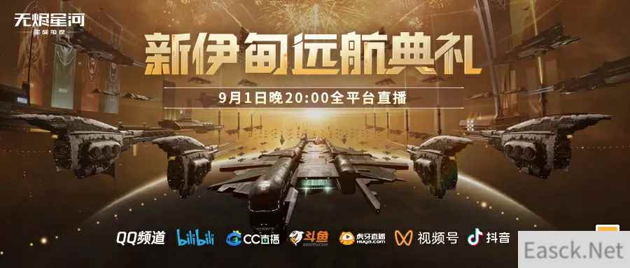探寻伊甸,逐梦星海 EVE无烬星河【远航典礼】 9月1日20点隆重开启 多重好礼等待飞行员领取 快来直播间参与互动 把好礼带回家吧~ 直播间专属福利 EVE无烬星河手游【远航典礼】将于9月1日20点正式开启,官方视频号、哔哩哔哩、虎牙、斗鱼、抖音、QQ频道等多个社交平台同步直播,观看直播更有海量礼品相送!