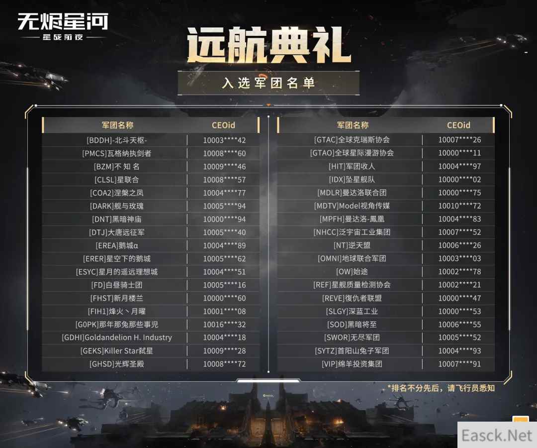 参与远航典礼的军团名称将被永久记录在远航典礼纪念碑上,它是新伊甸历史的见证,每一位来到新伊甸的飞行员,都能看到参与典礼的前辈们为开拓新伊甸做出的贡献。