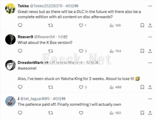 消息公布后,众多玩家纷纷表示了惊喜与兴奋,也有很多Xbox玩家催促道:“我Xbox版在哪呢???”还有玩家询问有关于游戏DLC的事宜。
