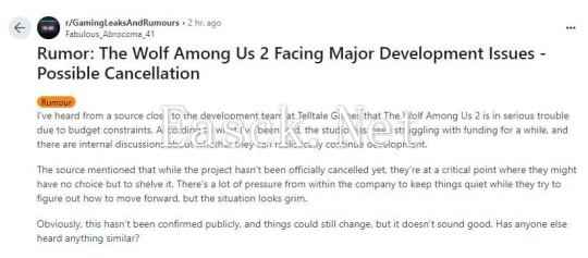 《与狼同行 2》是《与狼同行》的续集,故事发生在原作 6 个月后。该作最初于 2017 年宣布,但在 2018 年,Telltale Games 由于内部出现重大问题关闭了大部分工作室,并取消了《与狼同行 2》。随后,Telltale Games 大部分资产被 LCG Entertainment 收购。2019 年,LCG Entertainment 建立了由 Telltale Games 前员工组成的新工作室 AdHoc Studio,并宣布重启《与狼同行 2》,由 Telltale Games 和 AdHoc Studio 联合开发。 然而,如今情况似乎不容乐观。据 Reddit 论坛上一位叫 Fabulous_Abrocoma_41 的网友称,他从开发团队 Telltale Games 的消息人士处得知了一些关于《与狼同行 2》的内部状况。消息人士表示,《与狼同行 2》因预算限制深陷严重困境,开发团队在资金问题上挣扎已久,内部正在探讨游戏能否继续开发。虽然目前游戏尚未正式取消,但开发团队正处于关键时期,可能不得不将其搁置。公司内部压力巨大,要求他们保持沉默,同时他们还需要厘清如何推进,形势看起来颇为严峻。 更多《与狼同行2》相关资讯,敬请关注17173。 |