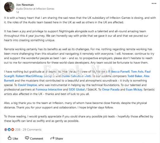 根据多位公司员工报道称,《夜莺传说》开发商 Inflexion Games 的英国分部即将关闭。 ![]() 在领英上,公司音频总监 Jon Newman 确认了公司即将关闭的消息。他写道:“我怀着沉重的心情分享 Inflexion Games 英国子公司即将关闭的不幸消息,以及随之而来英国的音频团队职位以及英国分部的其他人均受到了影响。” 首席音频设计师 Rebecca Parnell 以及高级音频设计师 Tom Avis 均确认受到了公司关闭的影响。 Inflexion 目前尚未正式确认分公司的关闭,受到影响的开发者数量暂不得而知。 Newman 向同事们致敬,称在过去四年里参与工作室的奇幻开放世界生存游戏《夜莺传说》的开发是“一种快乐和荣幸”:“我们可以自豪地诚实地说,我们已经拼尽全力,擒住过了全部心血来创造一款独特的作品。” ![]() |