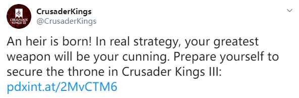 《十字军之王》官方Twitter说道:“一位继承人诞生了!在真正的战略中,你最强的武器将是你的狡猾。做好准备在《十字军之王3》取得王位吧!”,与此同时开发商Paradox也确认本作将于2020年正式推出。