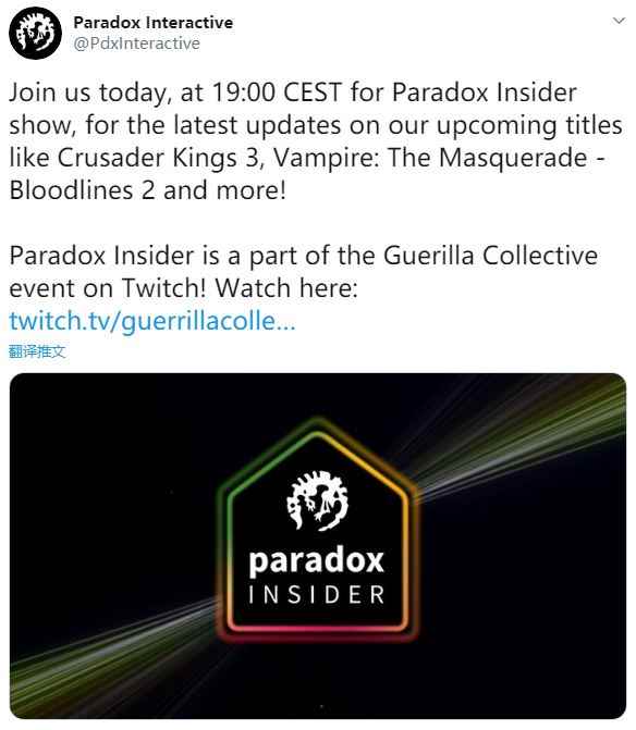 P社官方推特今日(6月13日)发文,确认将举办Paradox Insider show,公开他们即将发售的一些新游的消息,这次直播活动将作为Guerrilla Collective线上发布会的一部分,在北京时间6月14日凌晨1点开始。