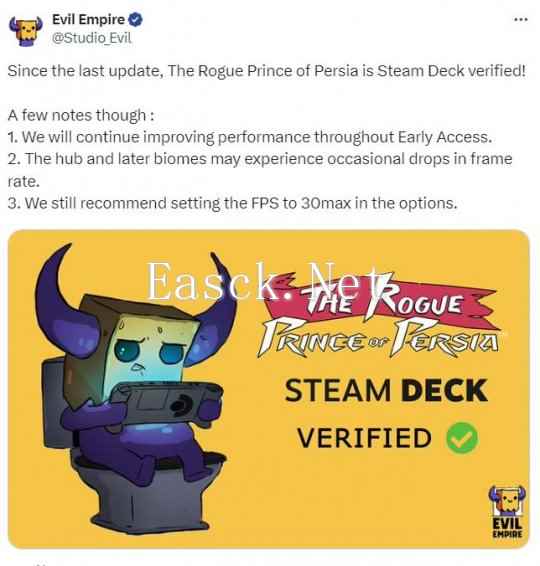 另外,《波斯王子:Rogue》还宣布游戏现已通过Steam Deck验证,玩家现在可以用Steam Deck随时随地畅玩本作了,不过值得注意的是,在Steam Deck游戏中后期,可能会出现帧率下降的情况,官方建议玩家把FPS设置为30max,后续Steam Deck的游戏性能将在抢先体验期间持续进行优化。
