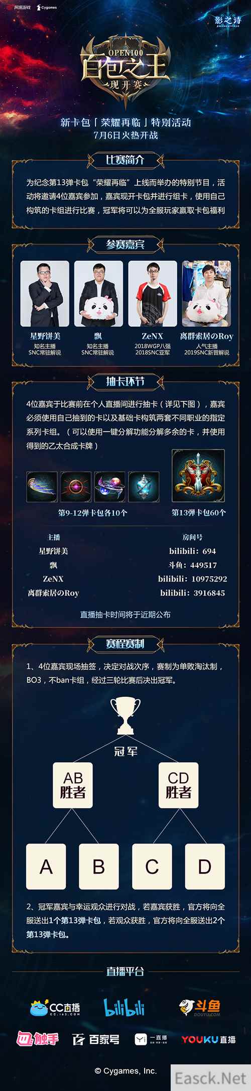全新企划来袭!百包之王现开赛即将开启! 为纪念新卡包上线,国服将于7月6日举办“百包之王现开赛”,邀请4位知名主播参加,他们分别是:星野饼美、飘、ZeNX、离群索居のRoy,他们将进行刺激有趣的现开对战,到底谁的右手更粗,谁的版本理解更深,谁能最终夺得“百包之王”的称号呢?请关注官方直播间,我们拭目以待!