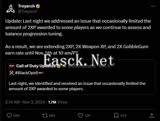 除此之外,Treyarch随后还宣布将延长《使命召唤21:黑色行动6》的双倍经验奖励活动,现持续到太平洋时间11月5日上午10点,也就是北京时间11月6日凌晨2点。