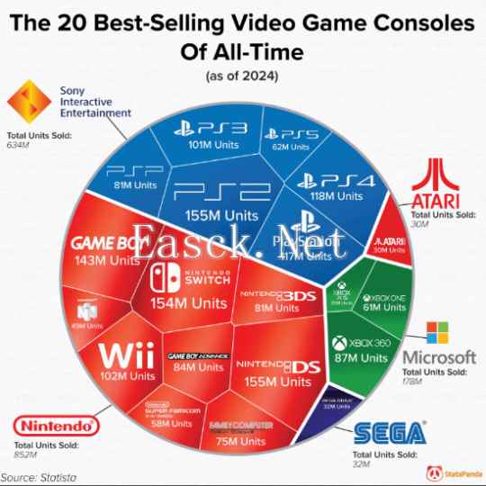 根据数据显示,任天堂主机的销量高居第一。其中,任天堂DS卖出1.55亿台、任天堂Switch卖出1.54亿台,Game Boy卖出1.43亿台,总销量为8.52亿台独占鳌头。