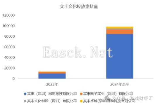 图:近90天《小小庇护所》微信小游戏畅玩榜&人气榜排名;来源:DataEye-ADX (二)公司投放情况 从投放素材量来看,根据DataEye-ADX的数据,实丰文化今年的投放量大幅飙升,已经达到了去年全年的7倍以上。 具体来看,实丰(深圳)网络科技有限公司作为主要负责游戏研发和运营的子公司,是集团最主要的投放主体,贡献了超过85%的素材量。