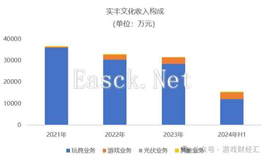 图:《出招吧大侠》投放趋势;来源:DataEye-ADX 二、玩具厂商布局小游戏,研发人员只有区区几十人 实丰文化成立于1992年,主营业务为各类玩具的研发设计、生产与销售,主要产品包括电动遥控玩具、婴幼玩具、车模玩具、动漫游戏衍生品玩具和其他玩具等。 依靠玩具业务,实丰文化于2017年在深交所上市。 然而,靠玩具上市的实丰文化上市即巅峰。自上市第二年起,公司的收入和净利润持续下滑,2020年和2021年甚至出现亏损。在业绩不断下行的压力下,实丰文化也开始谋求新的“出路”。 在2022年,实丰文化斥资1亿元增资安徽超隆光电科技有限公司,获得其25%的股权。此外,公司也设立子公司探索游戏研发和发行。 财报显示,目前公司涉足三大业务板块:玩具业务、游戏业务和光伏业务。其中,游戏业务增长迅速,光伏业务仍处于初期阶段,而玩具业务仍然是公司的主要收入来源。