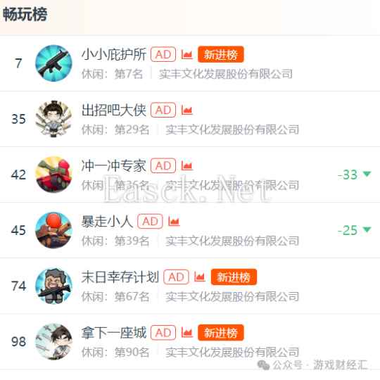 小游戏领域又多了一个新玩家。 上半年,华南玩具厂商-实丰文化,竟靠100多款小游戏实现了近3000万收入,同比增长353.63%。 10月,该厂商旗下的《小小庇护所》在微信小游戏畅玩榜中位列第7名,同时还有其他3款产品跻身畅玩榜TOP50。 一家玩具厂商,主业看似与游戏行业不直接相关,竟连爆多款小游戏?这家公司究竟有什么背景? 一、6款小游戏跑出,投放量翻了10倍 (一)产品排名:6款跻身畅玩榜TOP100,最高排名第七 根据ADX微信小游戏畅玩榜的数据,在2024年10月,实丰文化共有6款产品跻身微信小游戏畅玩榜TOP100,其中3款为新进榜的产品。 《小小庇护所》位列微信小游戏畅玩榜第7名,力压《躺平发育》《猛鬼宿舍》《天天象棋》《贪吃蛇大作战》等知名产品。