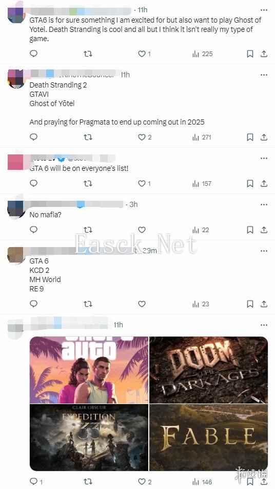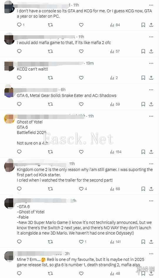 这四款游戏同样获得了评论区多数玩家的共鸣。此外,玩家们还提及了《四海兄弟:故乡》、《毁灭战士:黑暗时代》、《漫威1943》和《无主之地4》等作品,同时也对可能于2025年发售但尚未公布的《生化危机9》、《黑色行动7》以及《Pragmata》等游戏表示了期待。