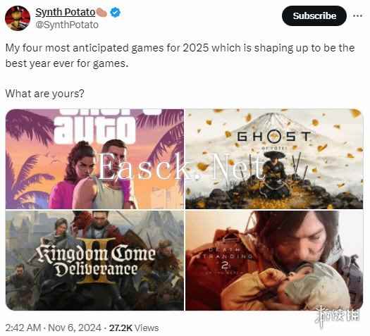随着2024年步入尾声,玩家群体开始热切期盼2025年的游戏阵容。推特用户Synth Potato列出了他最为期待的四款游戏——《GTA6》、《羊蹄山之魂》、《天国:拯救2》和《死亡搁浅2》,并预测“2025年有望成为游戏史上辉煌的一年”。