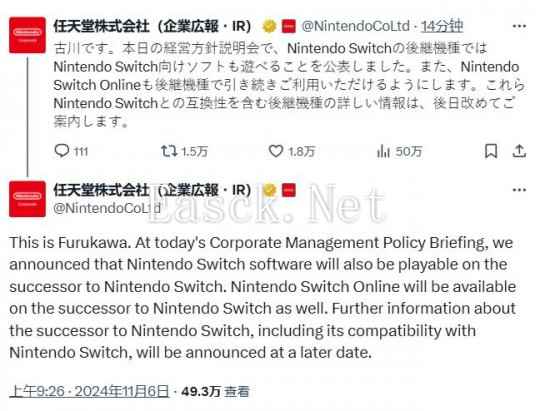 根据任天堂社长古川俊太郎通过任天堂IR官方X发布的消息,Switch继任者确定将支持向下兼容,能够游玩Switch游戏,并且Switch继任者还会继续提供Switch Online会员服务,更多Switch继任者的细节和与Switch兼容性的信息,将在稍后公布。 Switch继任者将在任天堂本财年结束之前公布,即2025年3月31日之前。