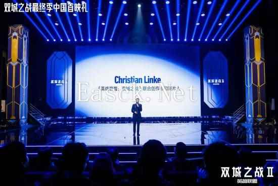 (从左至右:拳头游戏中国娱乐业务商业运营负责人张正中先生、环球音乐大中华区数字&商业高级副总裁丁楠女士、腾讯英雄联盟系列市场及IP负责人方可为先生) 腾讯视频、bilibili同步播出,游戏联动、观影活动轮番上演 当晚的发布环节中,《英雄联盟:双城之战》制片人Christian Linke代表剧集制作团队率先登台,首先表达了对所有中国《英雄联盟》玩家和剧集观众的感谢,并带来了诸多全新消息。