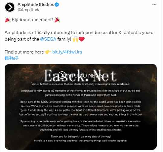 世嘉子公司Amplitude Studios工作室(《无尽空间》《无尽地牢》)今日宣布,正式脱离世嘉回归独立。 Amplitude Studios于2016年被世嘉飒美收购,工作室今日发布公告称: 在过去的8年里,作为世嘉大家庭的一员并与他们的团队一起工作是一段令人难以置信的旅程。我们学到了很多东西,以我们从未想象过的方式成长,并一路结识了很多好朋友。现在我们的人生道路走向了不同的方向,分道扬镳后我们将继续为他们加油打气,祝福他们在未来能够取得令人兴奋的成就。 我们将回归工作室根基和核心驱动力:创造力、创新以及与社区的紧密合作。这些价值观从一开始就塑造了我们,并将引领我们在激动人心的新篇章中继续前进。感谢你们与我们一起走过的每一步。为新的开始干杯。 |