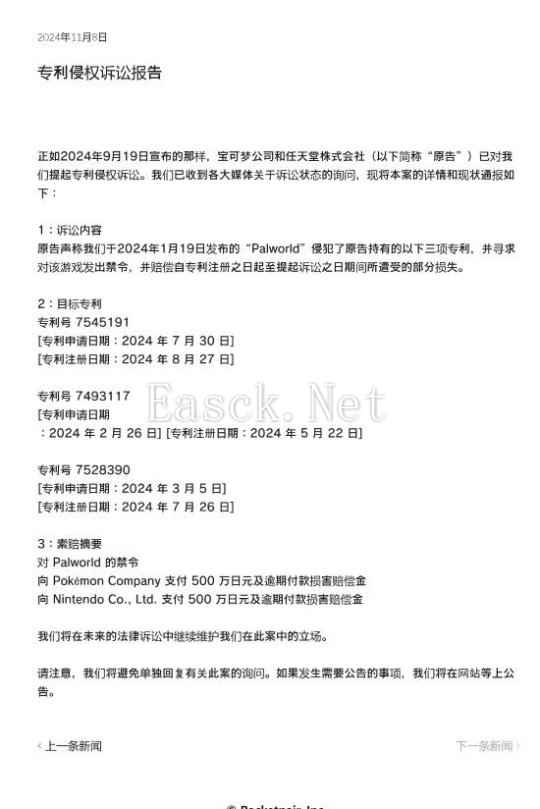 在9月份,任天堂联合宝可梦公司宣布共同起诉《幻兽帕鲁》开发商Pocket Pair,指控后者侵犯了任天堂的多个专利,要求停止侵权行为并给予赔偿,随后《幻兽帕鲁》开发商社长沟部拓郎也曾发推回应了这次起诉事件,他表示:“我们已经发布了公司的声明。感谢您的热情支持,我会继续努力做游戏!”