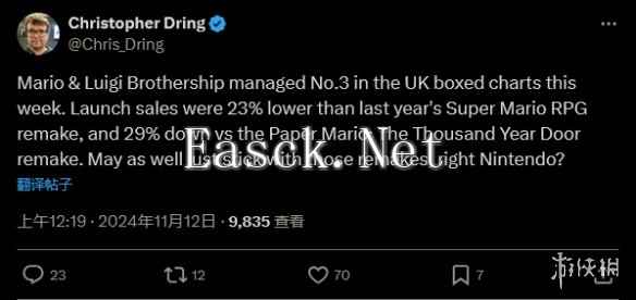 除了《龙腾世纪4》的销量情况外,Dring还透露了《马力欧&路易吉RPG 兄弟齐航!》本周在英国实体销量排行榜上位居第三。然而,这一成绩低于去年的《超级马里奥RPG》以及《纸片马里奥:千年之门》。他半开玩笑地表示:“任天堂或许应该继续推出重制游戏呢。”